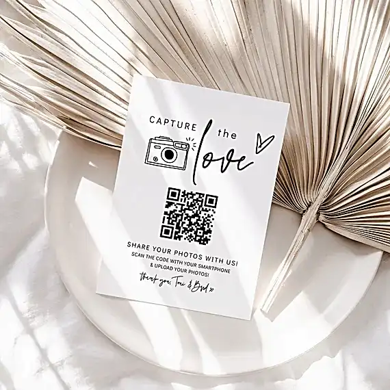 Düğün günü, tüm davetlilere özel olarak hazırlanmış küçük QR kodlu kartlar dağıtıyoruz. Her davetli, kendi telefonuyla bu QR kodu okutarak çektiği fotoğrafları kolayca belirlenen alana yüklüyor. Bu sayede